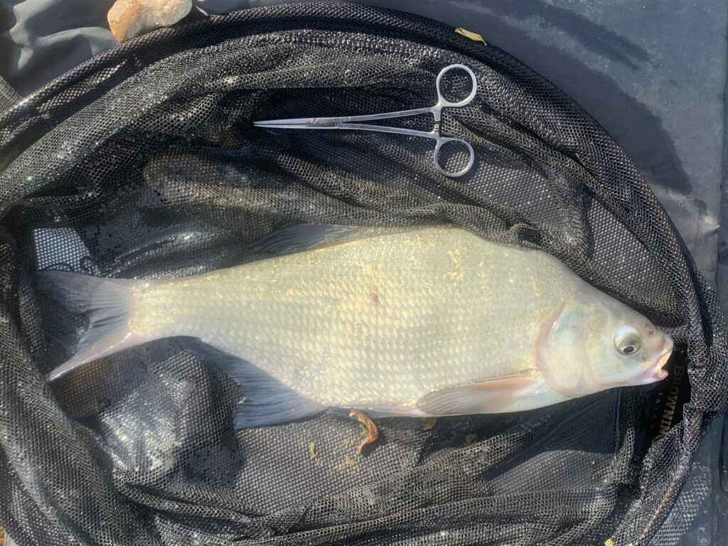 My float was soon bobbing under and I was into a small roach and this continued for a while with me getting almost a bite a cast. The red maggots were certainly attracting the smaller fish but I thought that I would change baits in the hope of catching something bigger. A piece of bread moulded round the hook was the change and things went quiet. There were several knocks on the float which I think were small fish then a more decisive bite, which turned out to be a better roach. I moulded on another piece of bread and it went quiet. I was sitting enjoying the peace when the feeder rod tip bent round and the rod started jiggling in its rest. I picked it up and could immediately feel a fish, it wasn’t putting up too much of a fight so I brought it in to the bank and netted a bream of about one and a half pounds. I re-cast then went back to float fishing, I waited a while but there were no more bites so I switched to sweetcorn. I don’t know why but I never seem to have any luck with sweetcorn and so after a while I went back to maggots and was catching a fish a cast once more.